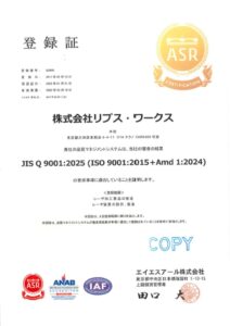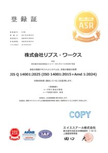ISO ISO9001 品質方針 楽しい品質管理 ~顧客の求める少し上~ 適用範囲 レーザー加工製品の製造 レーザ装置の設計・製造 ISO14001 環境方針 株式会社リプス・ワークスでは、地球環境の保全に資する為、全ての事業活動に適応する環境方針を策定する。 適用範囲 レーザー加工製品の製造 レーザ装置の設計・製造 BCP 事業継続力強化計画